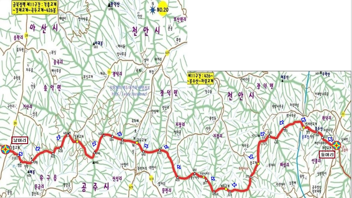 금북정맥 차령고개~각흘고개 까지 산행지도