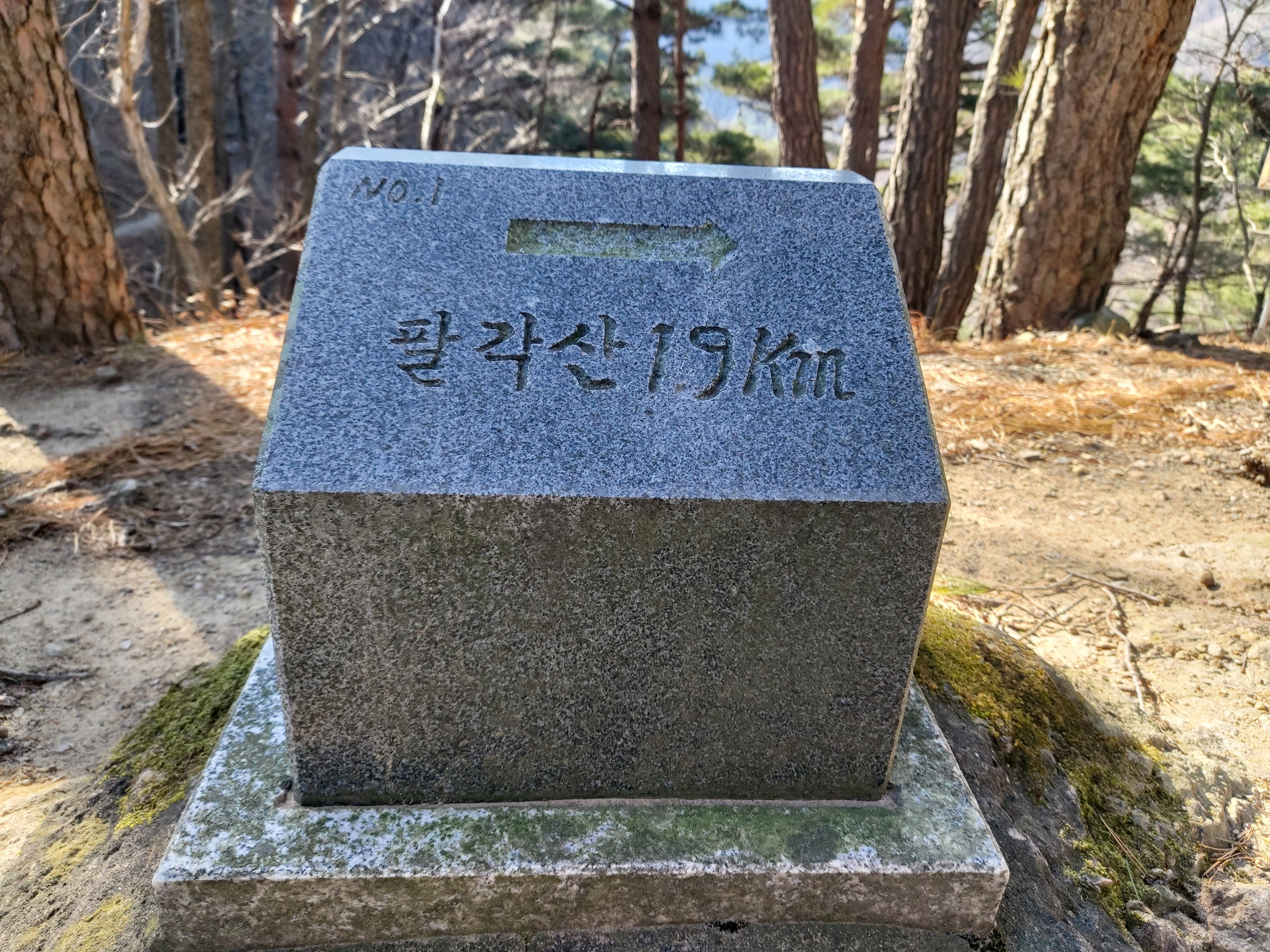 처음부터 가파른 등로길 팔각산 1.9km 안내석 11:26