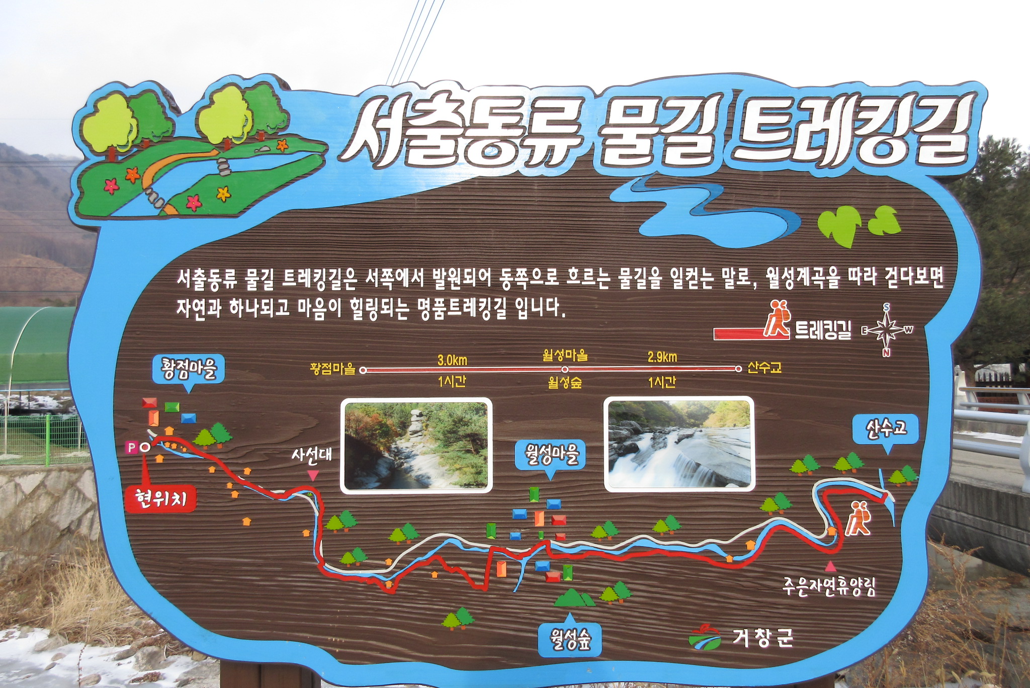 황정마을 주차장 서출동류 물길 트레킹길 안내판