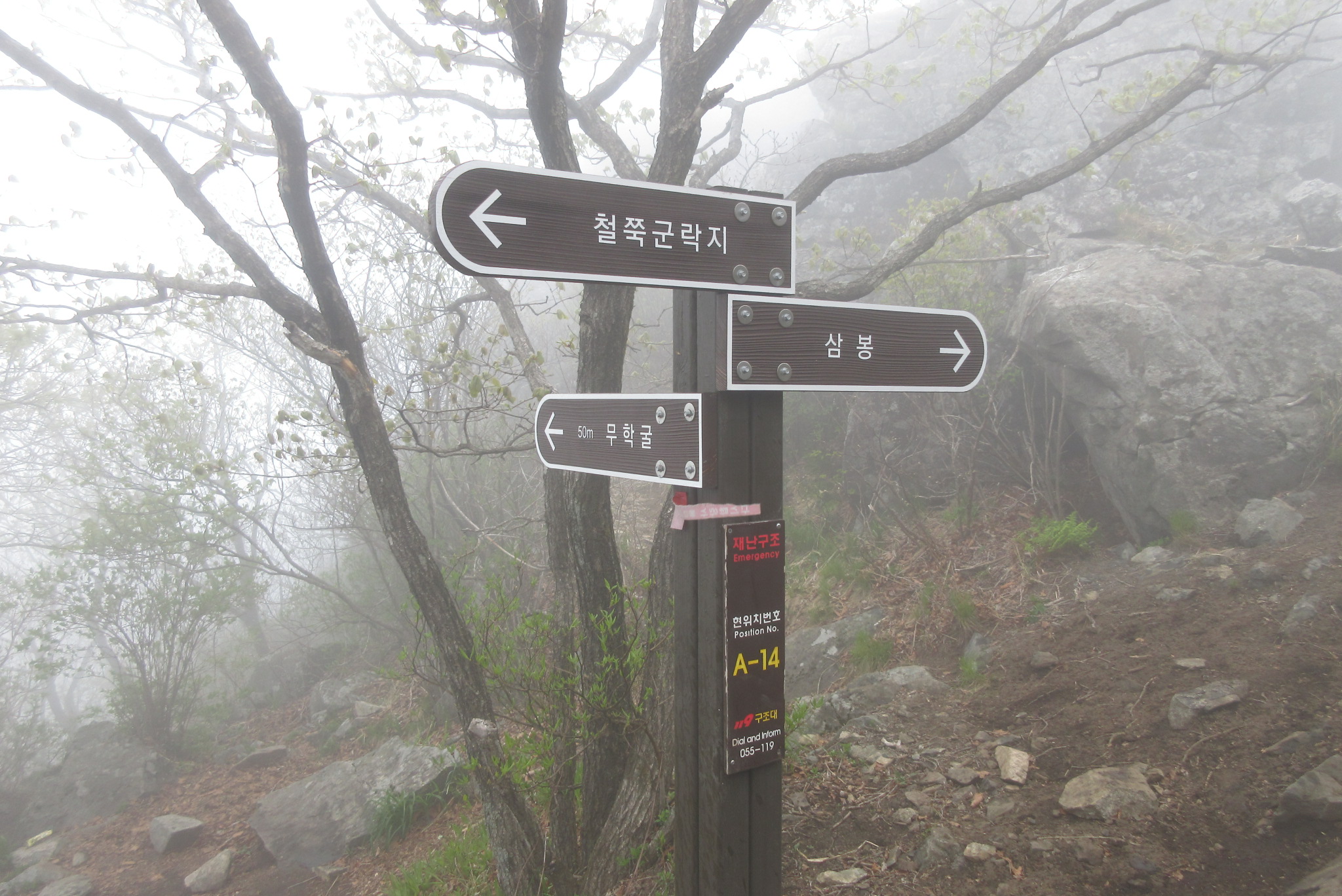 장박터널 등산로 입구1,4km 지점 삼거리 이정목 11:19
