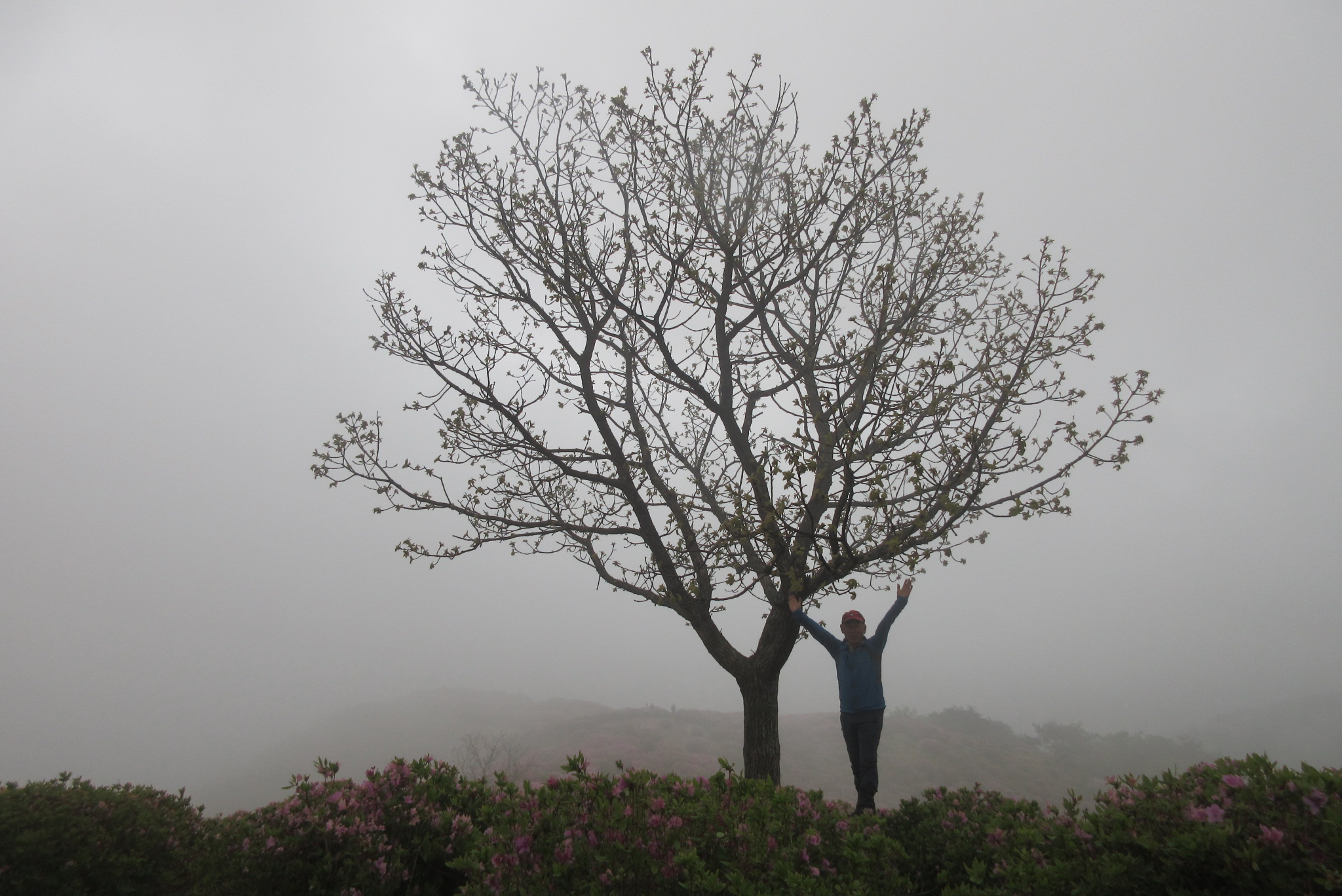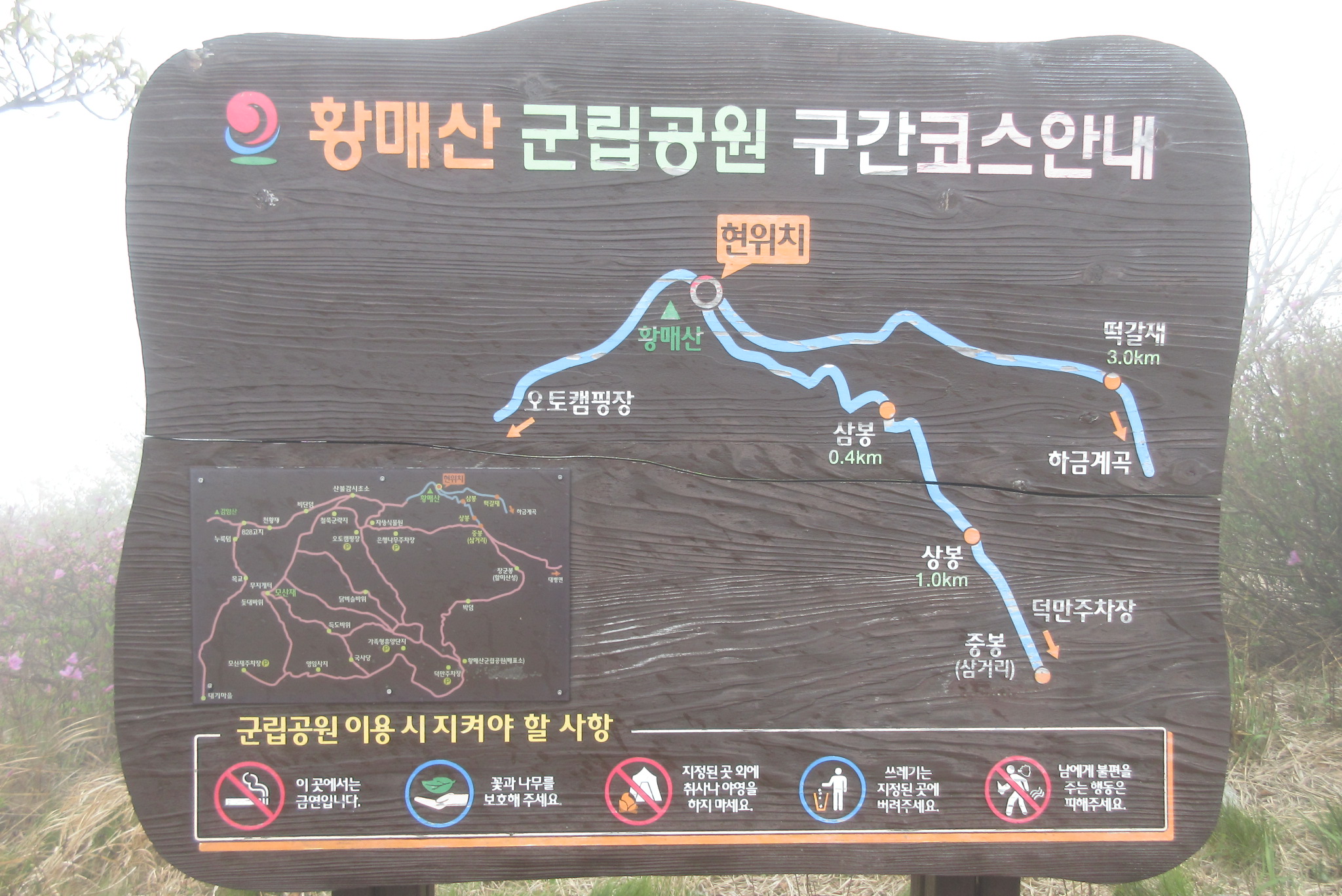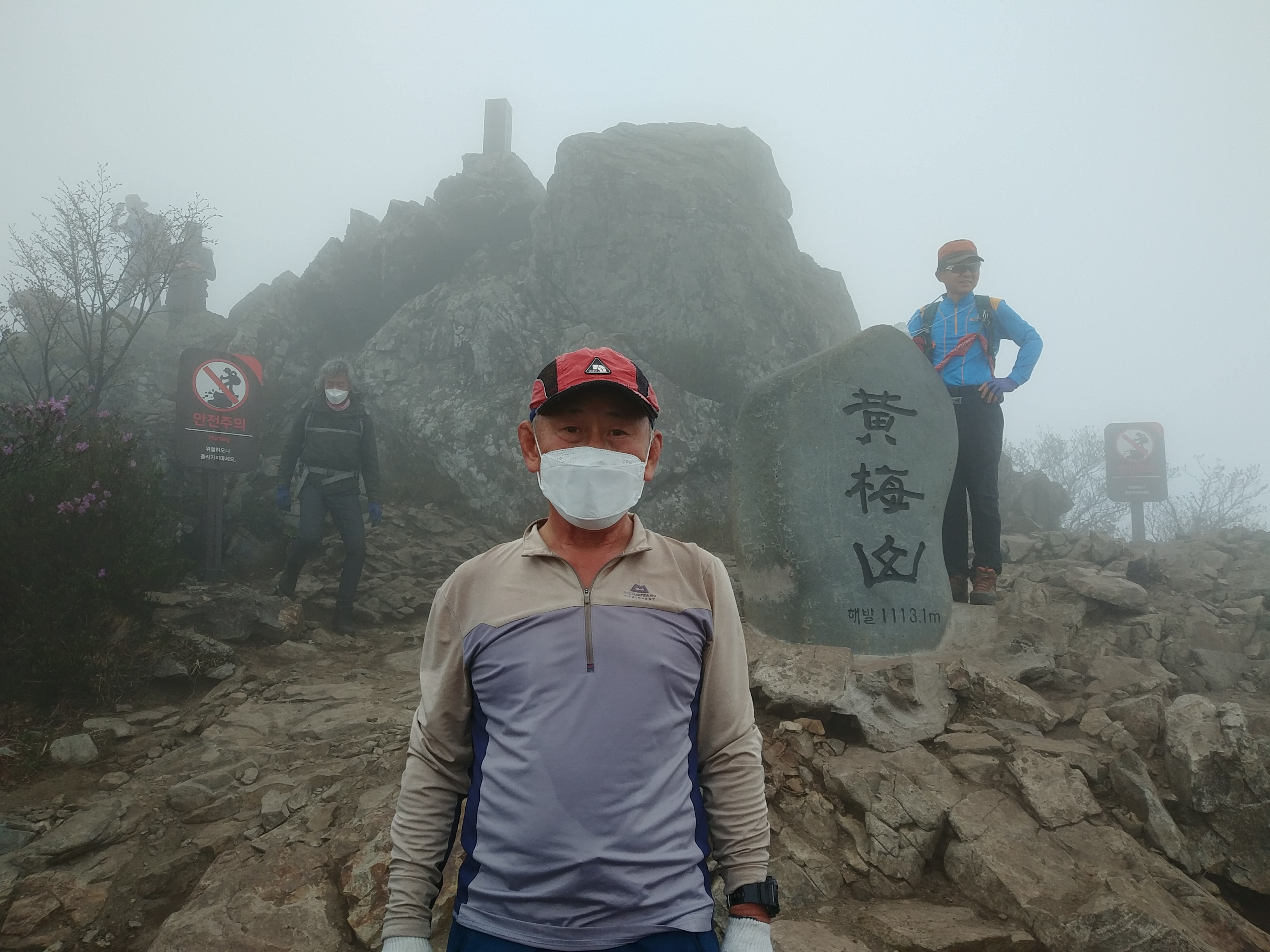 황매산 정상 표지석 안개속에 가려저 전경을 볼수없다.